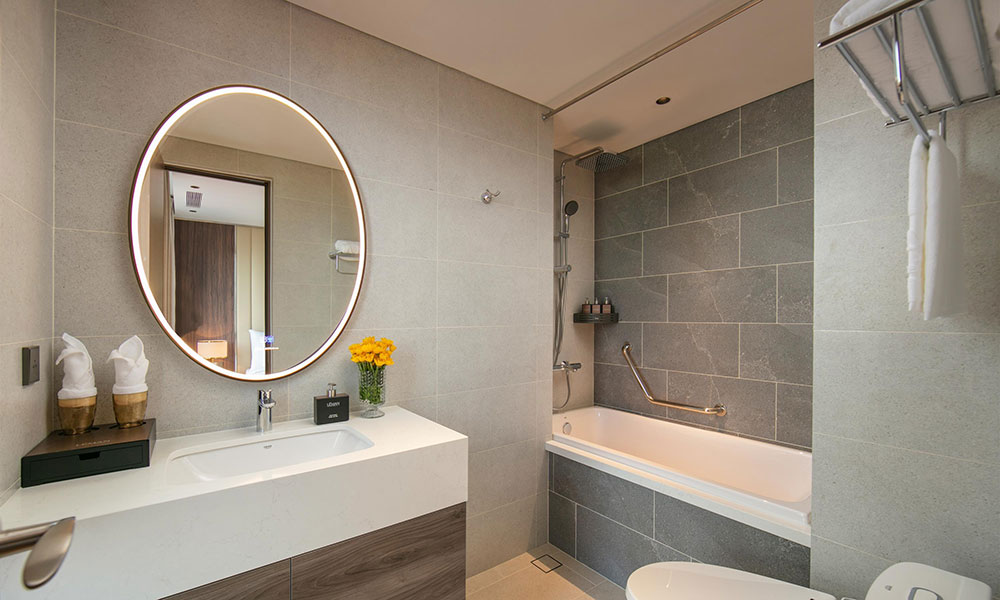 Căn phòng nổi bật với không gian được tối ưu hóa thông minh, tạo cảm giác rộng rãi và thoáng đãng. Điểm nhấn là chiếc giường Queen với ga trải giường trắng tinh khôi, mời gọi một giấc ngủ trọn vẹn. Ngay bên cạnh, hệ thống bàn làm việc và tủ đựng đồ được bố trí khoa học, đáp ứng mọi nhu cầu của bạn. Phòng tắm hiện đại với bồn tắm lớn ốp gạch men sang trọng, với gương tròn lớn và ánh sáng dịu nhẹ, tạo nên một không gian thư giãn tuyệt vời.