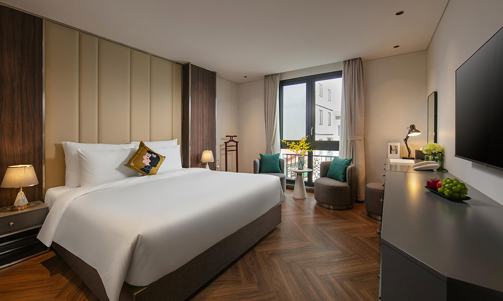 Phòng được trang bị giường King với đệm êm ái, bộ ga gối cao cấp và gối điểm nhấn màu vàng sang trọng. Khu vực bàn làm việc và bàn ghế tiếp khách nhỏ được bố trí hợp lý, kèm theo bình hoa tươi, mang lại không gian thư giãn đầy cảm hứng. Cửa sổ lớn mở ra góc nhìn thành phố, cho phép đón ánh sáng tự nhiên vào phòng. Tivi màn hình phẳng, kệ console hiện đại và hệ thống đèn chiếu sáng được thiết kế tinh tế, tạo bầu không khí ấm cúng. Phòng tắm riêng với bồn tắm sang trọng, gương viền sáng và đồ dùng vệ sinh cao cấp giúp bạn tận hưởng những phút giây thư giãn tuyệt đối.