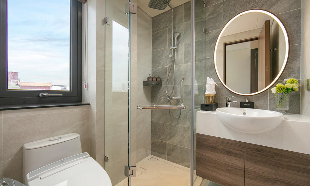 Không gian phòng hiện đại, nội thất trong phòng được lựa chọn tinh tế, gồm bàn làm việc tiện lợi, tủ quần áo rộng, TV màn hình phẳng và gương lớn tiện dụng cùng hệ thống chiếu sáng dịu nhẹ tạo cảm giác ấm áp. Phòng tắm đứng được ngăn cách bằng vách kính trong suốt, trang bị vòi sen hiện đại, hệ thống nước nóng ổn định, bồn rửa sứ trắng thanh lịch. Sàn gỗ cao cấp và cửa sổ đón sáng tự nhiên giúp không gian luôn thông thoáng và dễ chịu.