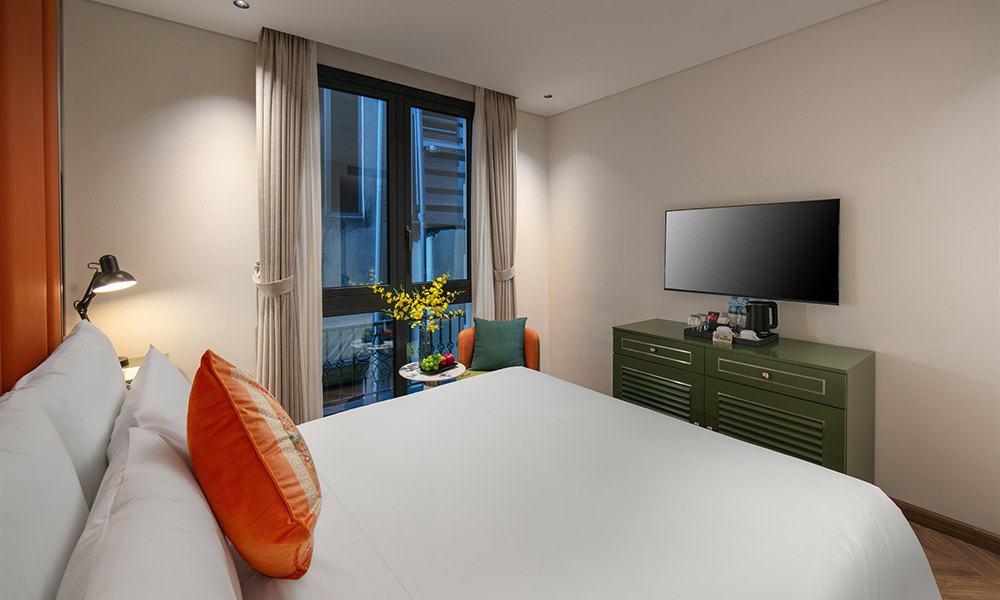 Phòng được thiết kế hài hòa với nội thất trang nhã, cửa sổ hướng phố đón ánh sáng tự nhiên cùng không gian nghỉ ngơi ấm cúng. Điểm nhấn là phòng tắm rộng rãi với bồn tắm lớn, giúp du khách thả mình trong làn nước êm dịu sau một ngày khám phá Hà Nội. Ngoài ra, phòng còn được trang bị đầy đủ tiện ích như Wifi tốc độ cao, điều hòa, tivi màn hình phẳng, minibar và bàn trang điểm, mang đến trải nghiệm lưu trú thoải mái và đáng nhớ.